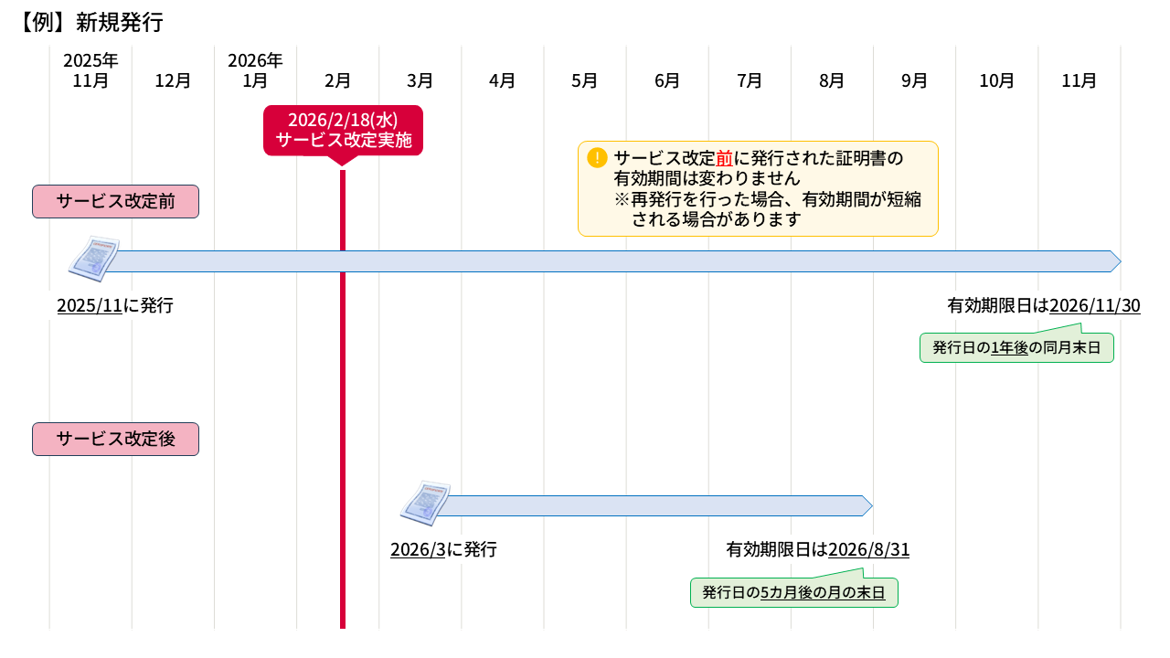 | 新規発行 | 証明書発行日の属する月の1年後の月末まで | 証明書発行日の属する月の5カ月後の月末まで |