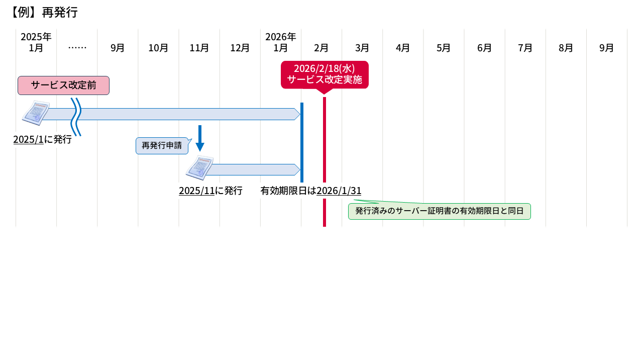 | 再発行 | 発行済みの証明書の有効期限日と同日 | 発行済みの証明書の有効期限日と同日 ※再発行前の証明書の残有効期間が6カ月より長い場合、証明書発行日の属する月の5カ月後の月末まで |